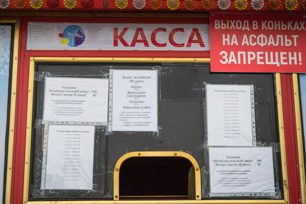 Еще два сугубо коммерческих катка открыты в парке Шевченко и на центральной аллее Аркадии. Судя по внешнему оформлению, они принадлежат одному и тому же предпринимателю. Цены здесь повыше. Вне зависимости от дня недели 45 минут будут стоить 100 гривен. Сюда входит прокат коньков, поэтому приходить со своими выгоднее ровно в два раза. За взятые напрокат коньки придется оставить залог — 300 гривен либо документ.