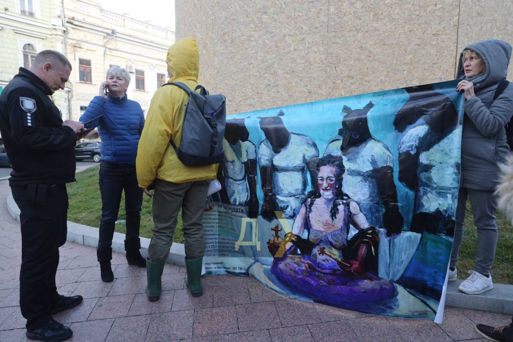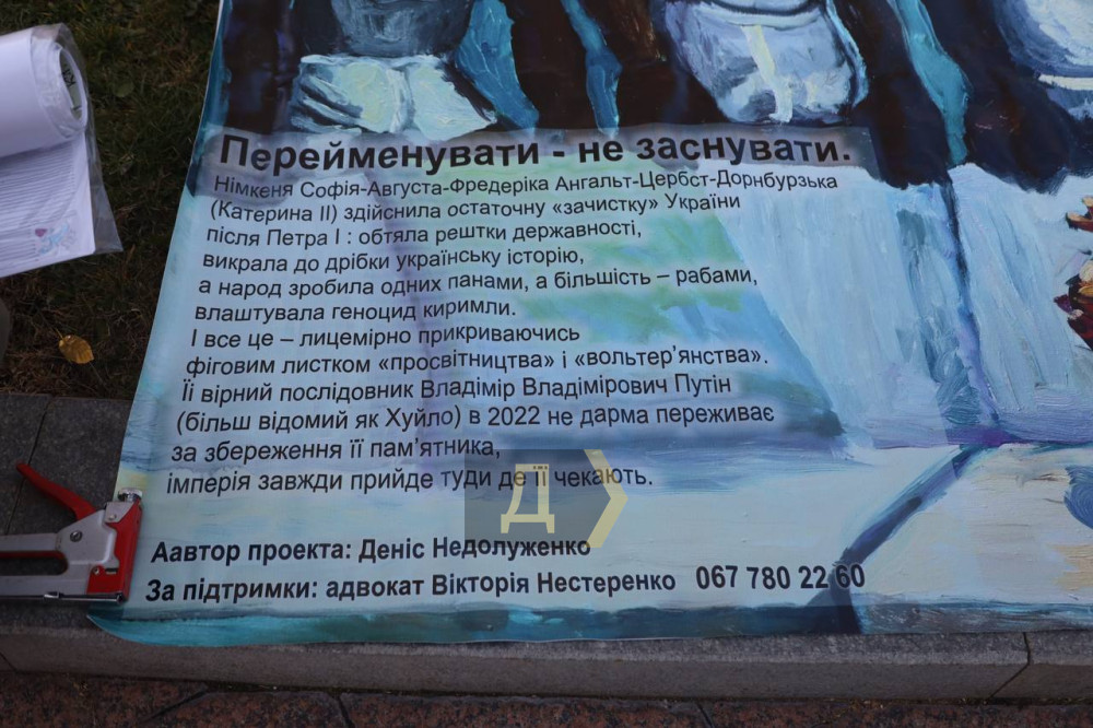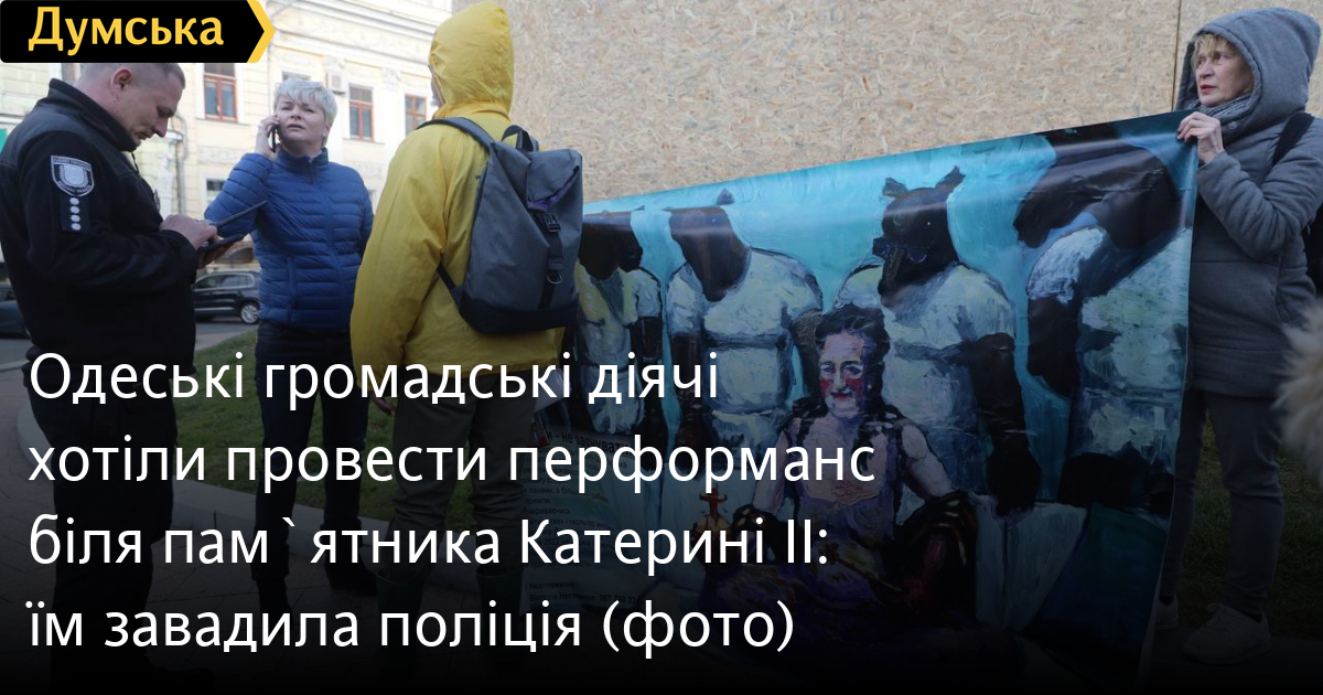 Перформанс біля пам'ятника Катерині II не змогли провести одеські громадські діячі та художники. Повісити репродукцію картини Дениса Недолуженка на конструкцію, яка захищає пам'ятник, їм завадили співробітники КП «Муніципальна варта» та поліцейські.