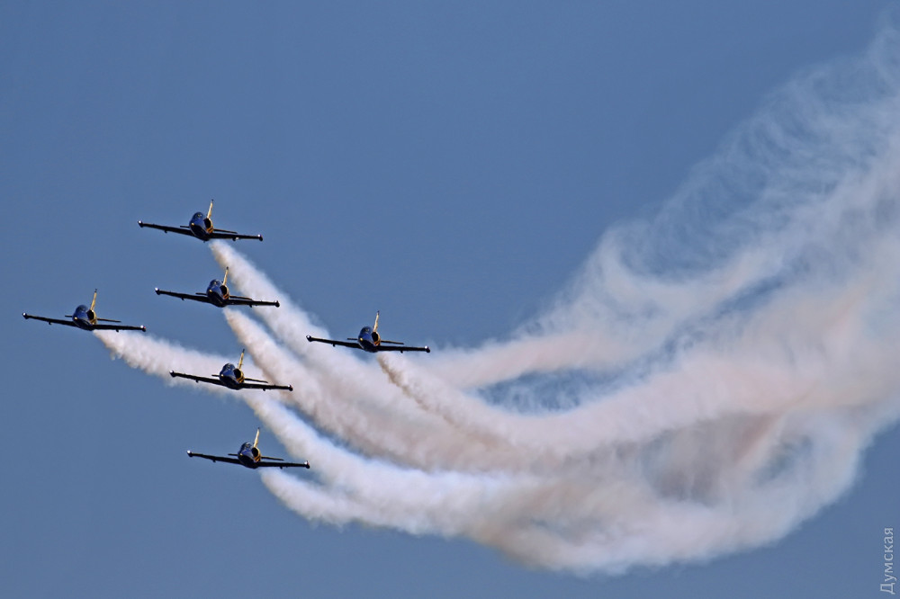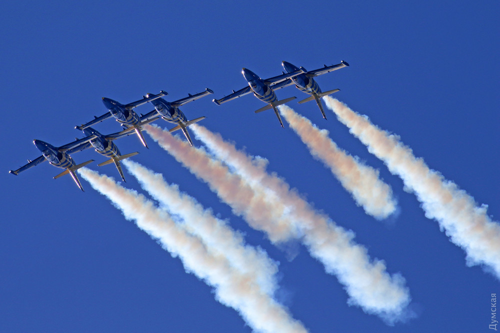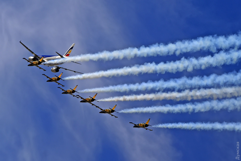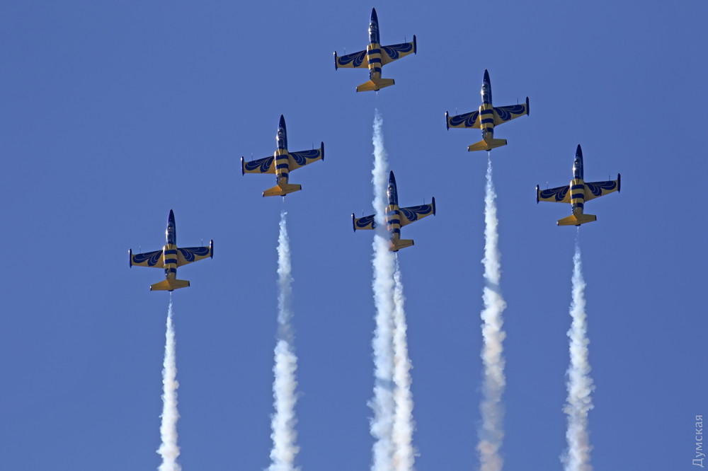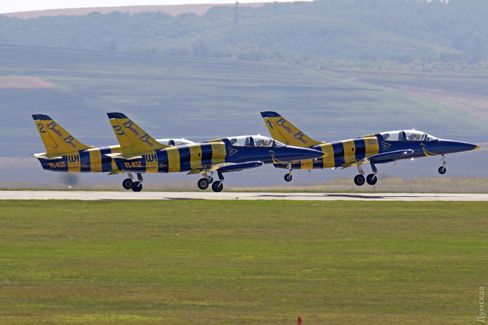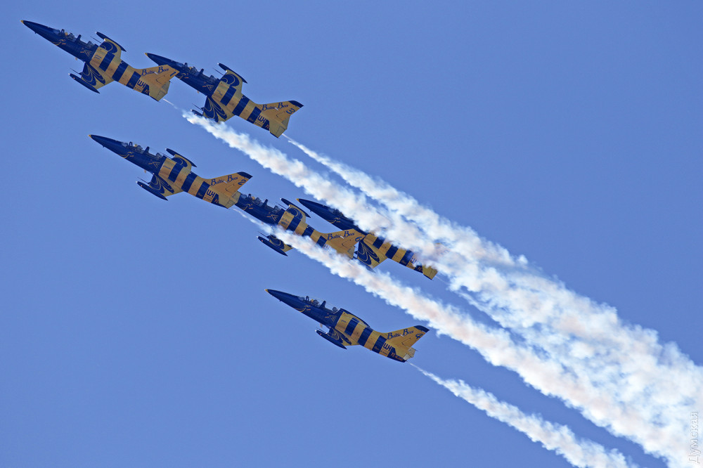 Аэробатика началась с группового пилотажа «Румынского аэроклуба», выступавшего на спортивных самолетах Extra 300, а затем в небо поднялась известная латвийская пилотажная группа «Балтийские пчелы» (Baltic Bees). Кстати, учебно-боевые L-39, на которых выступают латвийские летчики, несколько лет назад подверглись ремонту и модернизации на Одесском авиазаводе. Кроме прочего, на каждый борт установили генератор дыма для более эффектного выполнения пилотажа и произвели сложнейшую трудоемкую покраску с использованием очень дорогих лаков и перламутровых красок. Заводчане достойно справились с заданием, хотя нужный результат был достигнут не сразу — самолеты пришлось несколько раз перекрашивать.