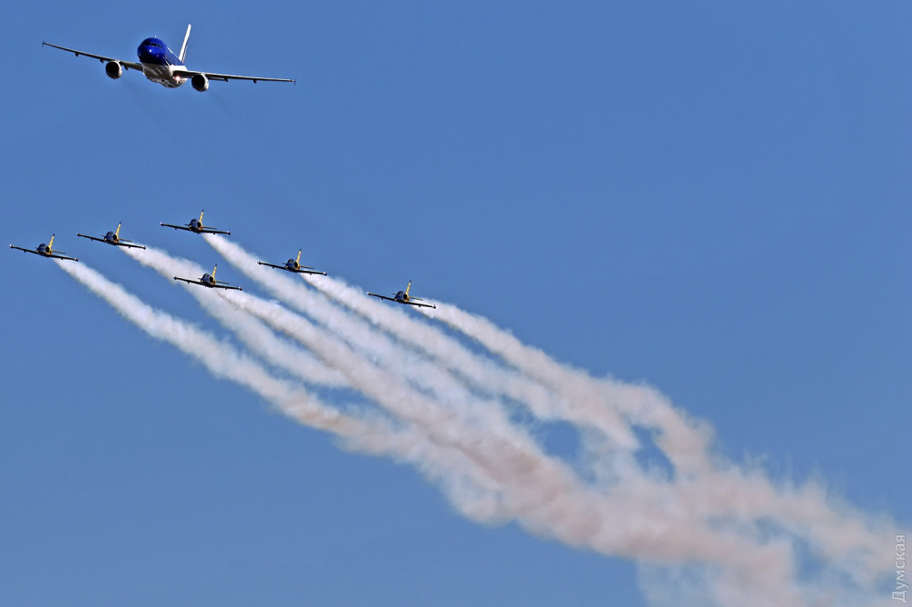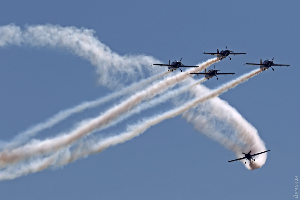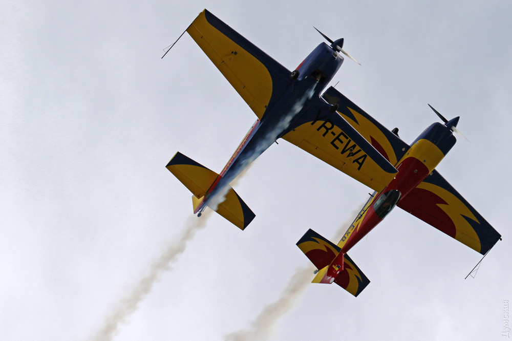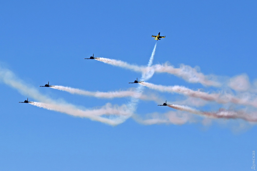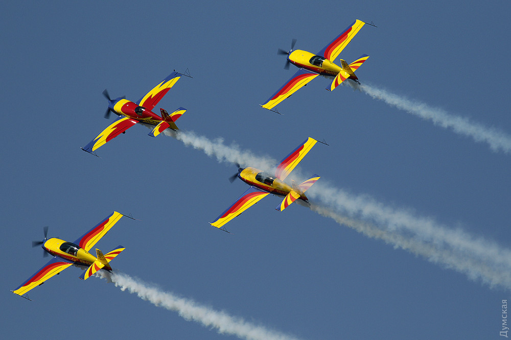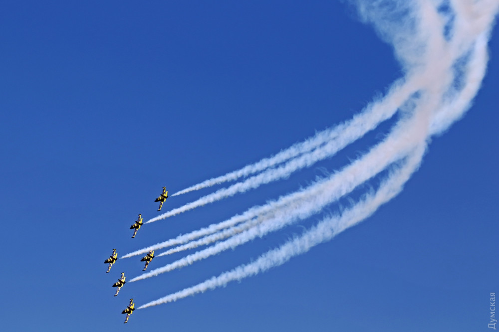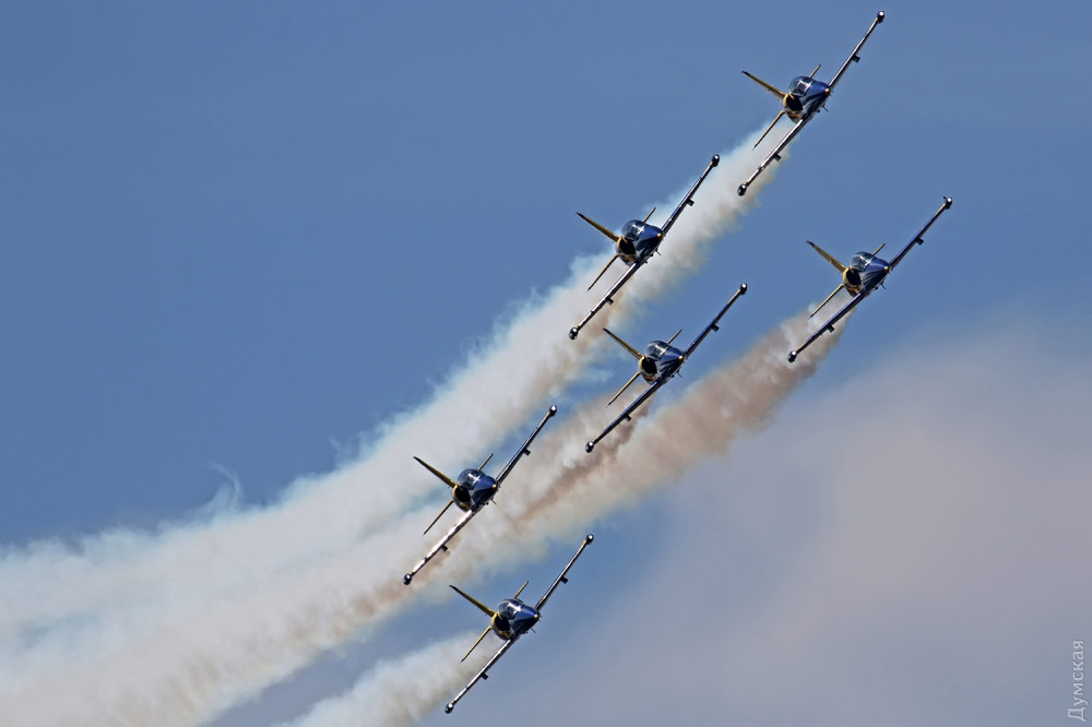 Аэробатика началась с группового пилотажа «Румынского аэроклуба», выступавшего на спортивных самолетах Extra 300, а затем в небо поднялась известная латвийская пилотажная группа «Балтийские пчелы» (Baltic Bees). Кстати, учебно-боевые L-39, на которых выступают латвийские летчики, несколько лет назад подверглись ремонту и модернизации на Одесском авиазаводе. Кроме прочего, на каждый борт установили генератор дыма для более эффектного выполнения пилотажа и произвели сложнейшую трудоемкую покраску с использованием очень дорогих лаков и перламутровых красок. Заводчане достойно справились с заданием, хотя нужный результат был достигнут не сразу — самолеты пришлось несколько раз перекрашивать.