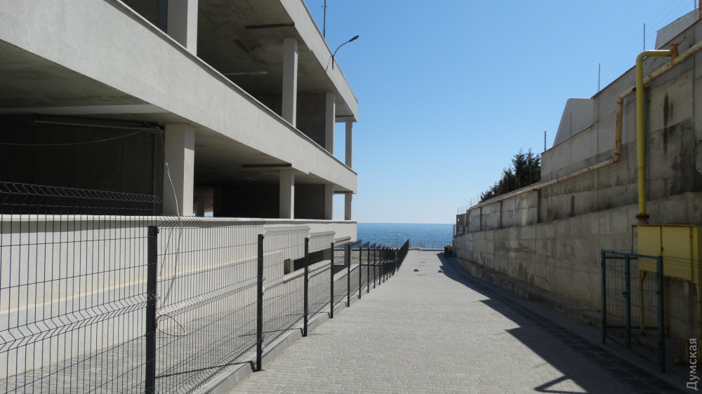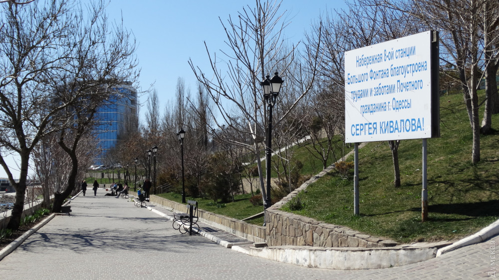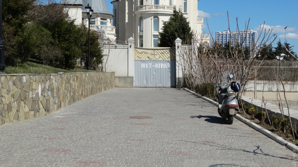 Сразу за домом приемов МГУ располагается поселение мореплавателей, точнее домики яхт-клуба, в которых проживают известные одесские судьи и бизнесмены. Чуть выше от берега построены десятки таунхаусов. Пляжей в этом районе как таковых нет. На заборе вокруг огромного недостроя «Морская симфония» (что-то у них опять происходит, никак не закончат) висит табличка «выход к морю». Там, и в самом деле, можно спуститься по бетонной тропе на такой же бетонный пляж, который горожане называют «плитами». Часть плит привели в порядок, а некоторые все еще остаются раскуроченными временем и волнами. Строители «Симфонии» когда-то обещали превратить это место в роскошную набережную.
