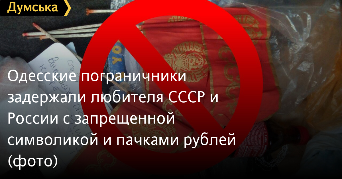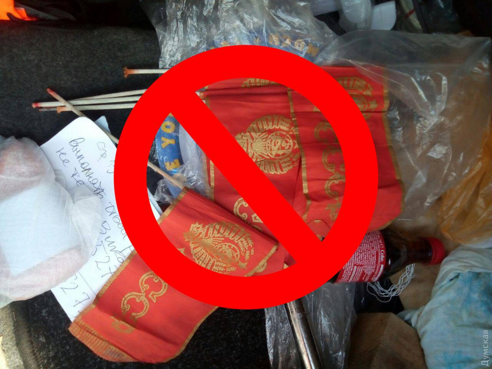 Как сообщили в Южном региональном управлении Госпогранслужбы Украины, мужчина вез красные флажки с гербом СССР, наклейки с изображением флага ВМФ СССР, медали с портретом Жукова, портреты Путина, изображения российской военной техники. Рядом лежал пакет с крупной суммой в рублях.