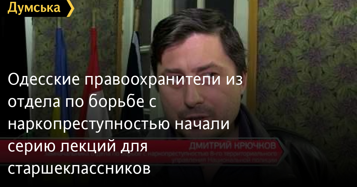 Одесские правоохранители из отдела по борьбе с наркопреступностью начали серию лекций для старшеклассниковОдесские правоохранители из отдела по борьбе с наркопреступностью начали серию лекций для старшеклассников СМЕРТЬ РОССИЙСКИМ ОККУПАНТАМ! Заметили ошибку? Выделяйте слова с ошибкой и нажимайте control-enter Думская ТВ. Сюжеты: