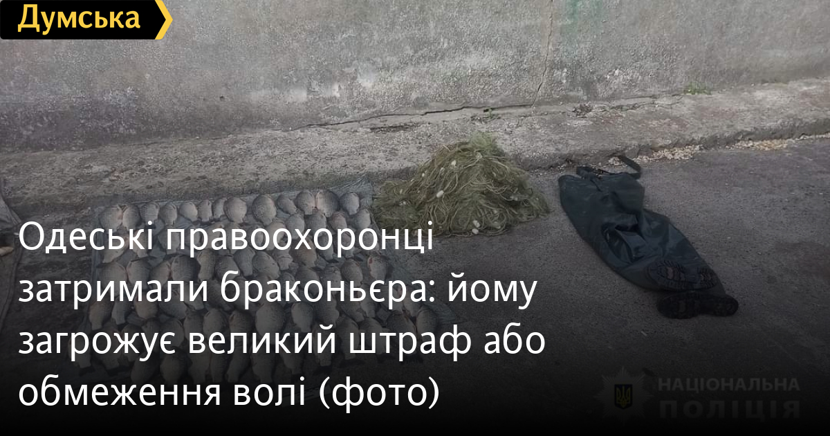 Одеські правоохоронці затримали браконьєра: йому загрожує великий штраф або обмеження воліБраконьєра, який займався незаконним рибним промислом на озері Сасик, викрили правоохоронці. Як повідомили у пресслужбі поліції Одеської області, 30-річний житель Татарбунар рано-вранці, під час комендантської години, повертався з риболовлі на автомобілі ВАЗ, коли його зупинили патрульні. Під час огляду машини вони знайшли в багажнику сітки та рибу. Викликана на місце слідчо-оперативна група встановила, що чоловік рибалив на озері Сасик біля села Борисівка. У нього вилучили сітки загальною довжиною понад 450 м, 78 карасів загальною вагою 32 кг та авто. За попередніми підрахунками, збитки, завдані державі браконьєром, перевищують 120 тисяч гривень. Відомості про подію внесли до ЄРДР за ч. 1 ст. 249 Кримінального кодексу України. Це правопорушення карається штрафом від 17 тис. до 51 тис. гривень або пробаційним наглядом на строк до трьох років, або обмеженням волі на той самий строк. Помітили помилку? Виділяйте слова з помилкою та натискайте control-enter Новини по цій темі: 29 липня 2025: В Усатово Одеської області сталася перестрілка: поліція працює на місці (відео, оновлено) 28 липня 2025: П'яний на "Ягуарі" або гіпертонік? Звільнений топ-посадовець одеської поліції хоче повернутися на службу 19 червня 2025: Дівчинку, яку шукали сотні одеситів, знайшли вбитою: поліція працює з чоловіком, ймовірно причетним до загибелі 27 травня 2025: Увели гектар в університету: на Одещині засудили земельних аферистів, але без посадки і Хвоста |