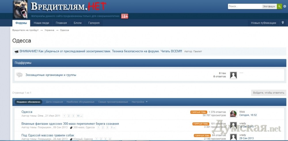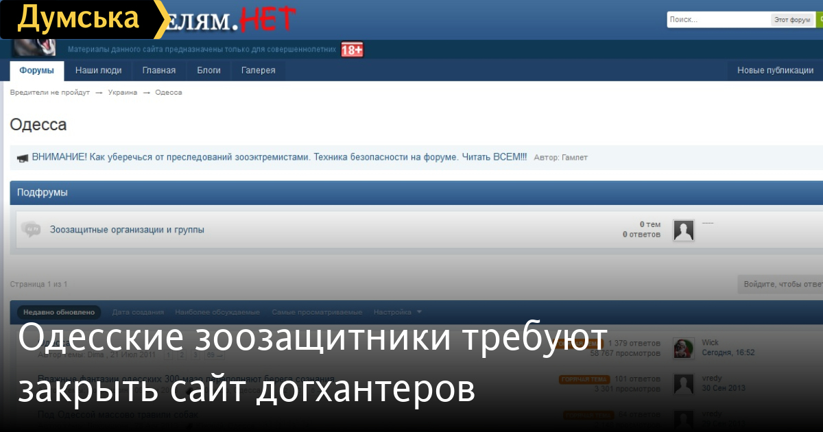 Следствие по делу об одесских догхантеров наконец сдвинулось с мертвой точки. Четыре уголовных дела, открытых еще в апреле нынешнего года, объединили в одно производство. Об этом «Думской» сообщила вице-президент одесского Союза защиты животных Ирина Момот. По ее словам, расследование ведут два сотрудника Приморской районной прокуратуры. Правоохранители пообещали защитникам животных обратить внимание на скандально известный ресурс «вредителям.нет» (vredy.to), где живодеры рассказывают единомышленникам, кто сколько убил бродячих собак и котов. Есть на этом сайте и ветка «Одесса». Многие случаи массового убийства бездомных животных, шокировавшие горожан, описаны здесь во всех подробностях. «Набадяжил в варево 2 банки изика (растолок в машине прям) и 2 канвалюты мета. Взял палочку и перемешал, плюс капнул жидкого дыма. Ждать пришлось минут 15 - косяк в 12 здоровых псин и штук 8-10 щенят. Вот так кастрюля помогла в десобакизации. Думаю можно писать – 20» , - «хвастается» на форуме пользователь под ником sadovnik (орфография оригинала сохранена). По словам Ирины Момот, в Европе сайт давно бы закрыли, но украинское законодательство такой возможности не предусматривает. «Но его можно хотя бы признать распространяющим насилие над животными. К сожалению, мое заявление в милицию по данному факту где-то затерялось в кулуарах и с июля не расследуется, — сокрушается общественница. – И все-таки есть подозрение, что этот сайт и его посетители – это заказ городских властей». Живодеры тем временем не дремлют. На днях жители частного сектора в районе 11 станции Большого Фонтана обнаружили трупы четырех домашних котов. «Животные погибли от сильных ударов по голове. Люди даже знают, кто это делает – их слегка ненормальный сосед со своей мамой. Сегодня я позвоню ему и объясню, что ему светит за это», — говорит Ирина Момот. СМЕРТЬ РОССИЙСКИМ ОККУПАНТАМ! Заметили ошибку? Выделяйте слова с ошибкой и нажимайте control-enter |