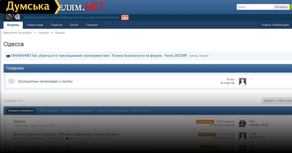 Следствие по делу об одесских догхантеров наконец сдвинулось с мертвой точки. Четыре уголовных дела, открытых еще в апреле нынешнего года, объединили в одно производство. Об этом «Думской» сообщила вице-президент одесского Союза защиты животных Ирина Момот. По ее словам, расследование ведут два сотрудника Приморской районной прокуратуры. Правоохранители пообещали защитникам животных обратить внимание на скандально известный ресурс «вредителям.нет» (vredy.to), где живодеры рассказывают единомышленникам, кто сколько убил бродячих собак и котов. Есть на этом сайте и ветка «Одесса». Многие случаи массового убийства бездомных животных, шокировавшие горожан, описаны здесь во всех подробностях. «Набадяжил в варево 2 банки изика (растолок в машине прям) и 2 канвалюты мета. Взял палочку и перемешал, плюс капнул жидкого дыма. Ждать пришлось минут 15 - косяк в 12 здоровых псин и штук 8-10 щенят. Вот так кастрюля помогла в десобакизации. Думаю можно писать – 20» , - «хвастается» на форуме пользователь под ником sadovnik (орфография оригинала сохранена). По словам Ирины Момот, в Европе сайт давно бы закрыли, но украинское законодательство такой возможности не предусматривает. «Но его можно хотя бы признать распространяющим насилие над животными. К сожалению, мое заявление в милицию по данному факту где-то затерялось в кулуарах и с июля не расследуется, — сокрушается общественница. – И все-таки есть подозрение, что этот сайт и его посетители – это заказ городских властей». Живодеры тем временем не дремлют. На днях жители частного сектора в районе 11 станции Большого Фонтана обнаружили трупы четырех домашних котов. «Животные погибли от сильных ударов по голове. Люди даже знают, кто это делает – их слегка ненормальный сосед со своей мамой. Сегодня я позвоню ему и объясню, что ему светит за это», — говорит Ирина Момот. СМЕРТЬ РОСІЙСЬКИМ ОКУПАНТАМ! Помітили помилку? Виділяйте слова з помилкою та натискайте control-enter |