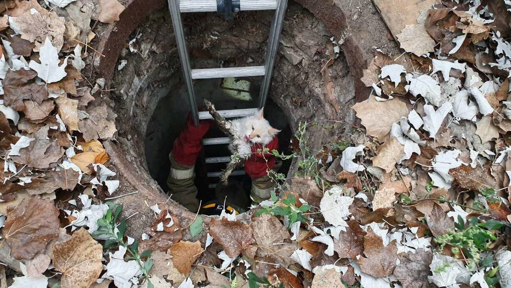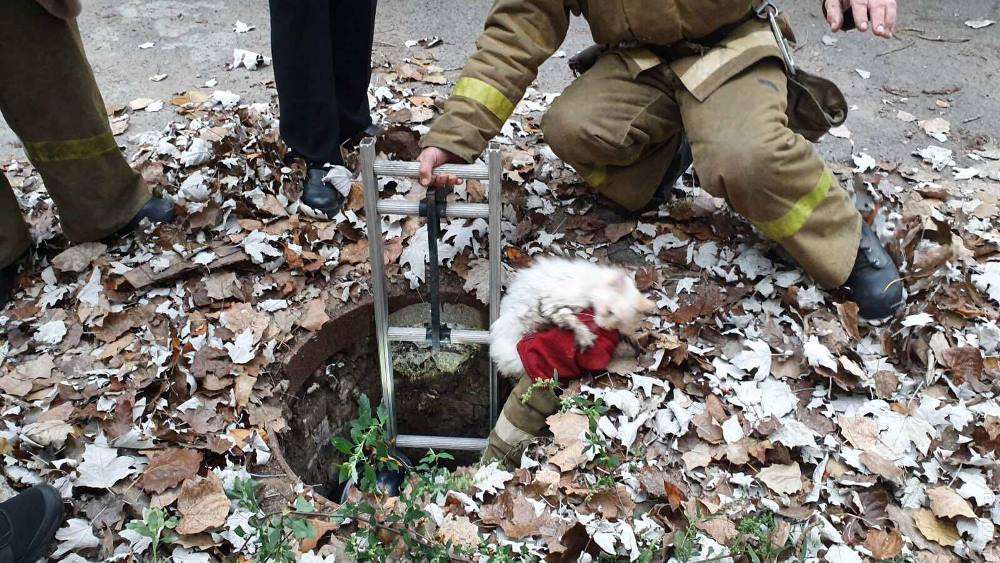 С помощью лестницы спасатели спустились в люк и достали животное.