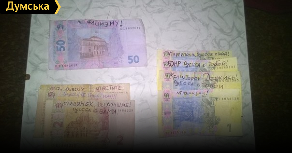 Таким образом сторонники федерализации пытаются выразить свое отношение к действующей власти. Перечень предлагаемых активистами надписей разнообразный – «Украины больше нет», «Не простим Одесский Дом Профсоюзов», «Бандеру прочь!», и т.д. Впрочем, участники этого «флешмоба» уже выставили на суд пользователей соцсетей банкноты с более «красноречивыми» лозунгами, в том числе с использованием нецензурной лексики.