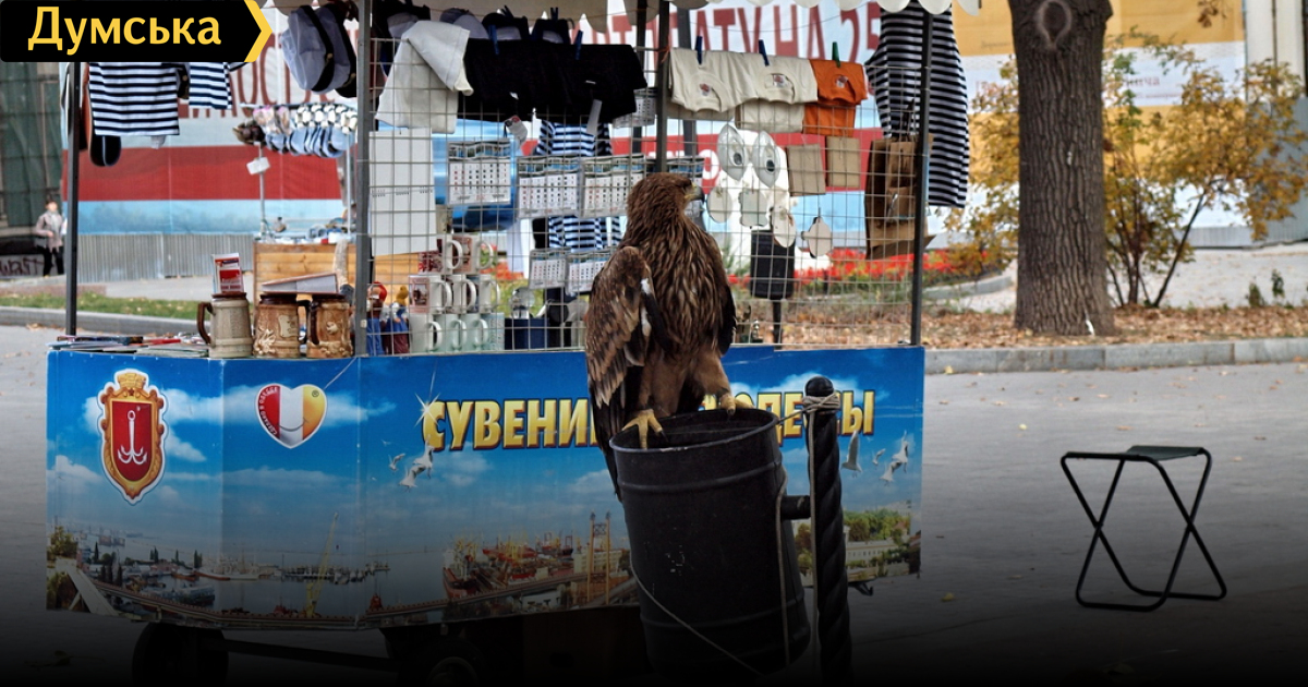 Корреспондент «Думской» стал свидетелем того, как два орла, прикованные к мусорной урне обосновались на Театральной площади. Птицы не показывали агрессии и не пытались покинуть свой «насест». Позже орлов забрали некие предприниматели, которые круглогодично приносят хищников на Приморский бульвар и предлагают прохожим запечатлеть себя на фото вместе с «птичками»