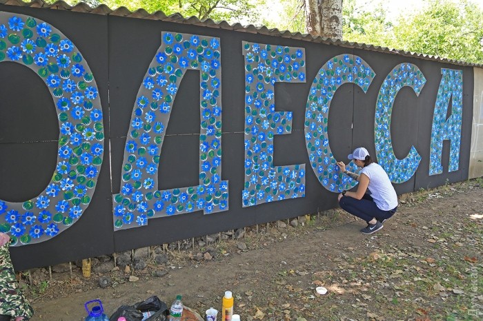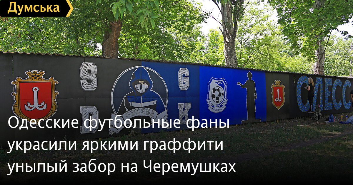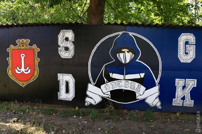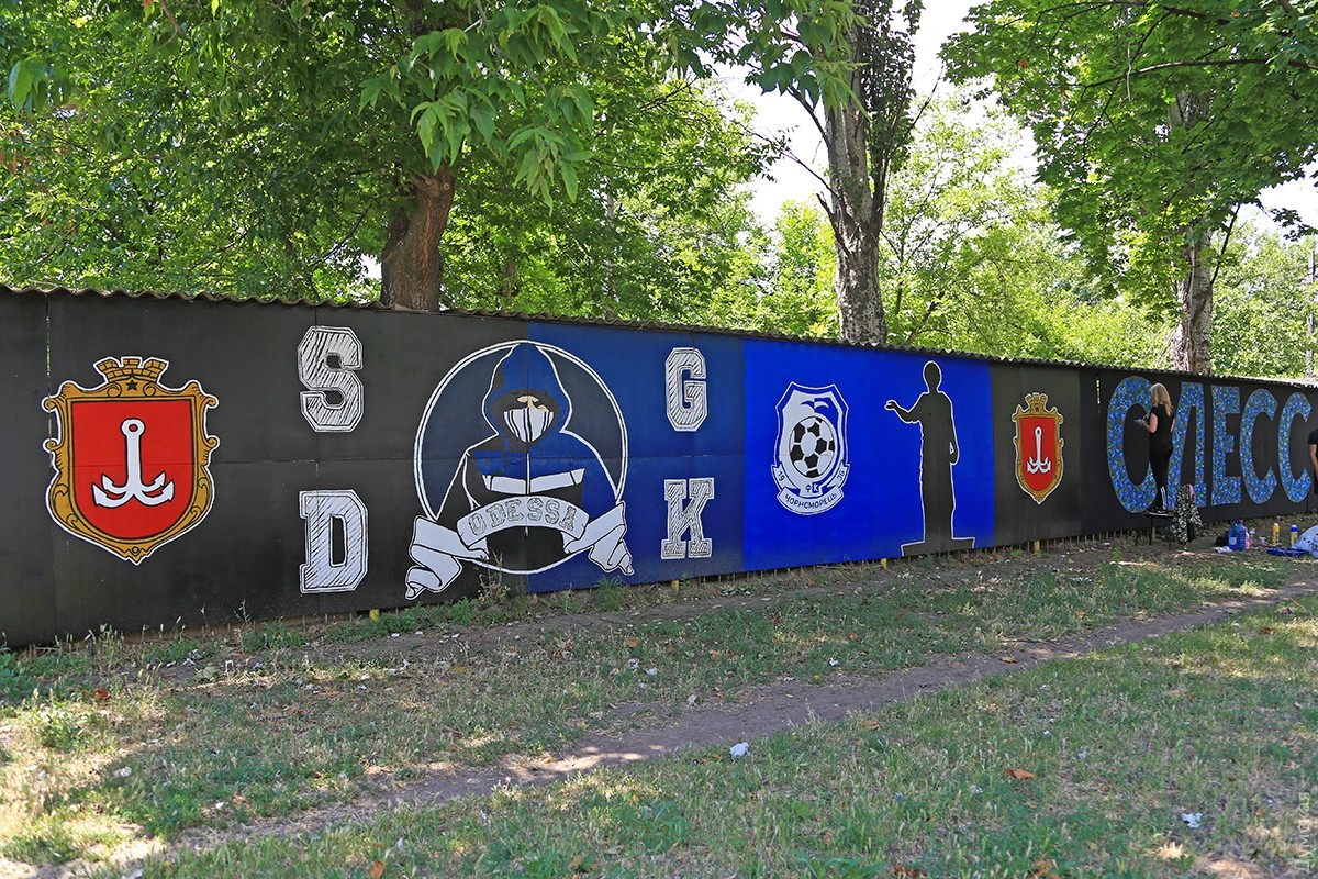 Несколько юношей и девушек тратят свое свободное время на облагораживание серой стены автостоянки. Граффити изображают одесскую символику и все, что относится к футболу и любимой команде.
