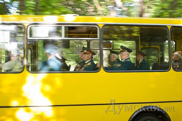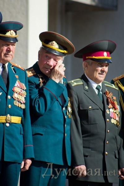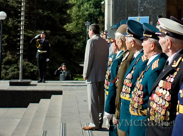 Затем перед участниками прошла рота почетного караула, которую вместе с ветеранами перевозили на автобусе от админздания на проспекте Шевченко до Думской площади, где тоже подняли Знамя Победы. Здесь ветеранов поздравил мэр Алексей Костусев, который в очередной раз напомнил о своих заслугах.