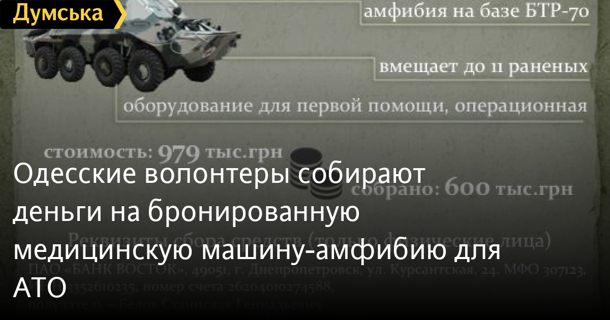 Общественная организация «Большая Одесса» инициировала сбор средств на производство бронированной «скорой помощи» для военнослужащих из Одессы и Одесской области, участвующих в АТО.