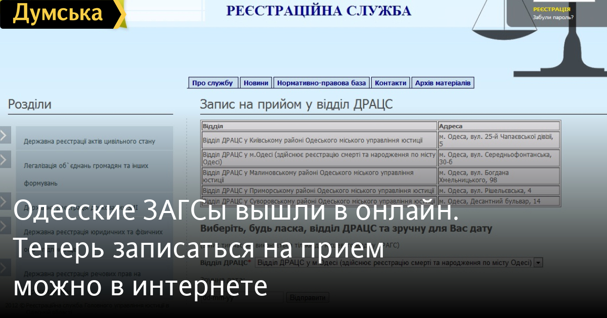 Одесские ЗАГСы начали запись граждан на прием в онлайне. Следующая инициатива стартовала в Южной Пальмире с сегодняшнего дня, чтобы упростить процедуру записи и избежать очередей в отделах регистрации актов гражданского состояния. «Данная услуга является новшеством в Украине и позволяет упростить процедуру записи на прием в отдел РАГС, не выходя из дома, — рассказывает глава регистрационной службы главного управления юстиции в Одесской области Игорь Лысенко. — Нововведение позволит каждому выбрать удобное время для приема, избежать появления очередей в отделах РАГС и станет очередным шагом на пути комфортного и качественного обслуживания граждан». Предварительная запись на прием в тестовом режиме пока что ведется только в отделе РАГС в г. Одесса, правда, пока только по вопросам регистрации рождения. Записаться на прием можно абсолютно бесплатно на официальном сайте Главного управления юстиции в Одесской области или на сайте регистрационной службы Главного управления юстиции в Одесской области. При этом все отделы РАГС продолжают вести традиционный прием граждан. СМЕРТЬ РОСІЙСЬКИМ ОКУПАНТАМ! Помітили помилку? Виділяйте слова з помилкою та натискайте control-enter |