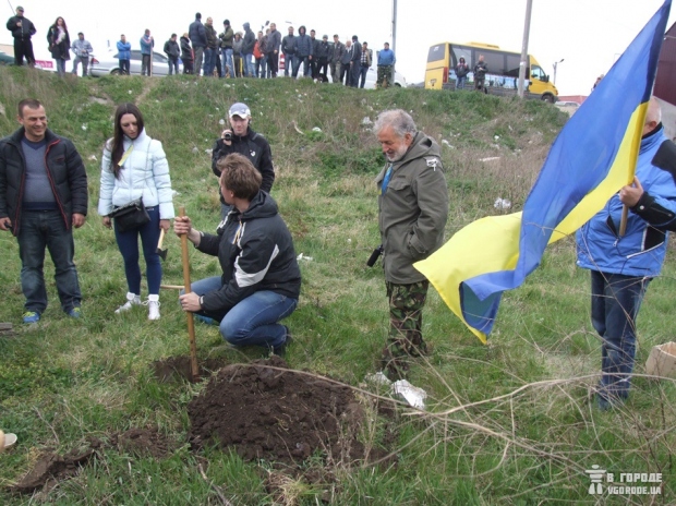 После этого активисты решили закапать около границы «топор войны» — в знак прекращения вражды. Они в буквальном смысле зарыли настоящий топор, сверху посадили дерево и оградили его шиной, символично выкрашенной в желто-голубой цвет.