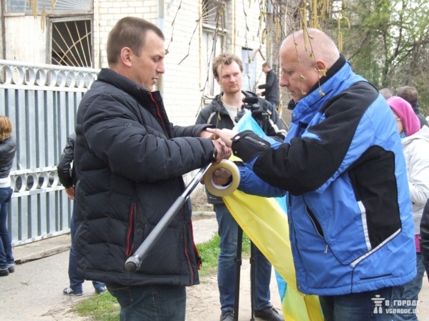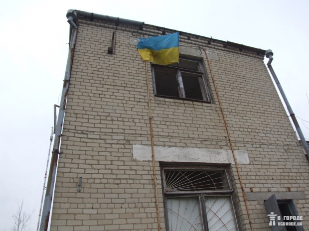 Поднять флаг сразу не получилось – неизвестный мужчина перекрыл активистам вход на территорию. Произошла небольшая стычка. Позже флаг все же удалось вывесить. Как объяснил глава местного сельсовета Анатолий Левицкий, база находится на балансе Минобороны и ее охранник-житель села должен подчиняться непосредственно им.