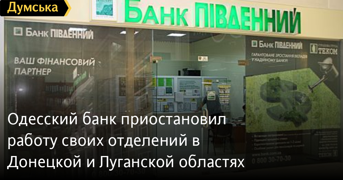 Одесский акционерный банк «Пивденный» приостановил работу всех своих отделений в Донецкой и Луганской областях.