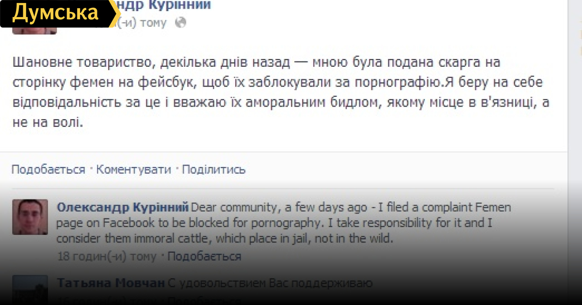 Фемен — сборище потаскух и продажных шалав, то что они делают аморально и отвратительно! Куренной просто молодчага, что имеет свое мнение, но все эти аккаунты в фейсбуках чушь) и ни на что не влияют — как светили титьками так и будут.