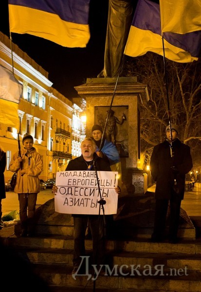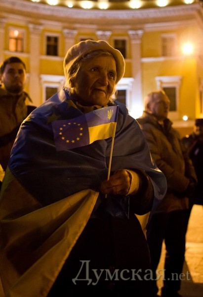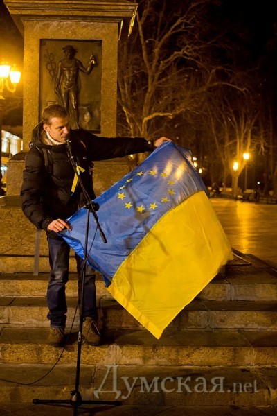 Ну а «фишкой» сегодняшнего вечера были поэтические экспромты некоторых выступающих. Кроме того, пришедшим к Потемкинской лестнице раздавали украинские флаги с европейскими звездами на голубой полосе.