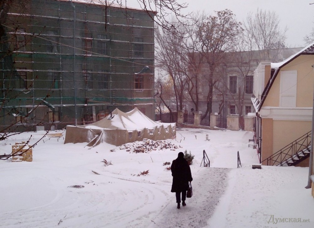 Здание муниципалитета по-прежнему выглядит осажденной крепостью («бандеровский штурм» никто не отменял), но меры предосторожности явно ослаблены. На Думской площади установлен легкий турникет и дежурят несколько милиционеров. В окрестностях интенсивно убирают снег — и вручную, и с помощью техники. В вестибюле горсовета нет размотанных пожарных шлангов, отсутствуют озабоченные люди в масках и революционно настроенные матросы с чайниками. Документы у входящих почти не проверяют.