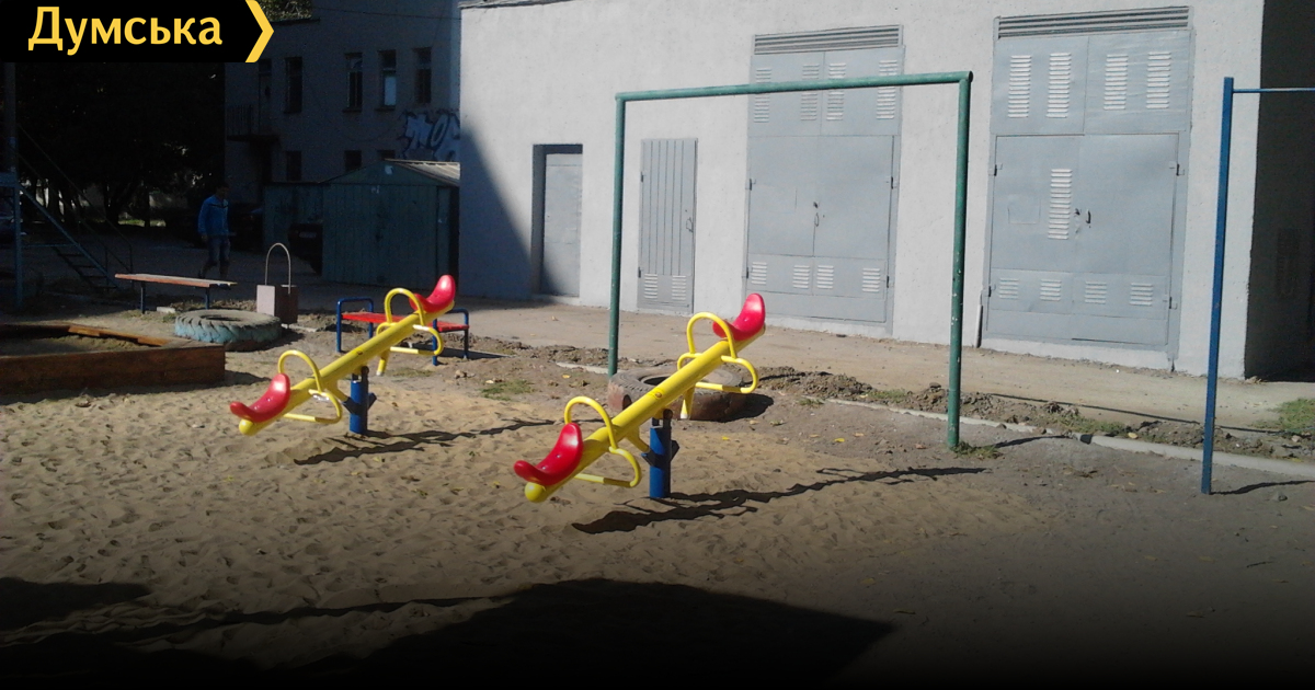 Прямо посреди футбольного поля во дворе по улице Королева, 100 недавно появилась детская площадка.