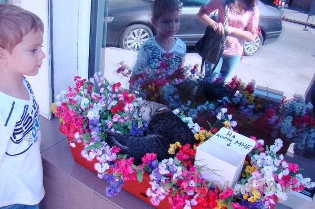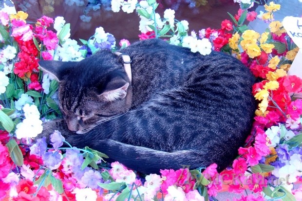 Переулок Вице-адмирала Жукова в центре Одессы последнее время стал объектом пристального внимания горожан и туристов. Дело в том, что в клумбах с искусственными цветами у тамошнего салона красоты частенько можно встретить большого кота, который сладко спит под лучами осеннего солнца.