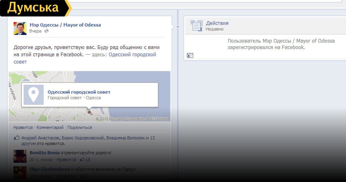Интересно, что страничка на «Фейсбуке» зарегистрирована не персонально на Алексея Костусева, а просто на «мэра Одессы». То есть, после выборов ей сможет пользоваться и преемник нынешнего городского головы. К слову, в «Твиттере» должность по-прежнему представлена Эдуардом Гурвицем. Вот такое сетевое двоевластие.