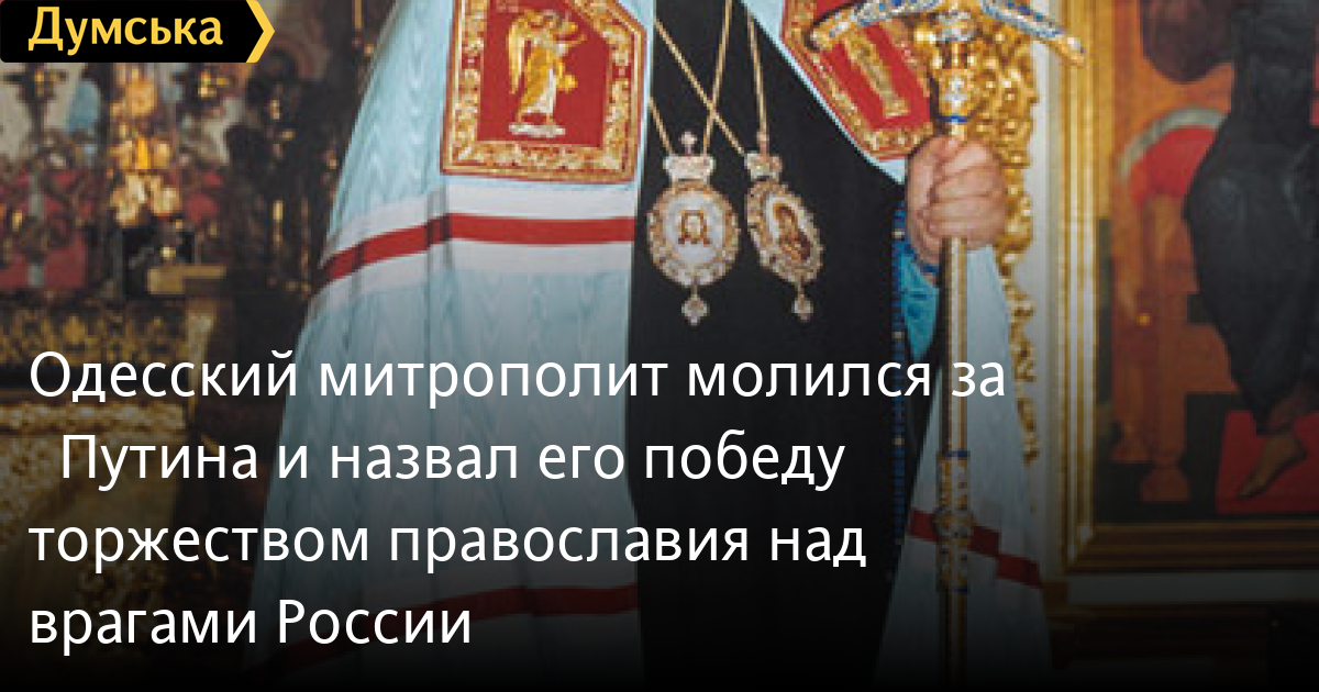 «От лица духовенства и верующих Одесской Митрополии Украинской Православной Церкви Московского Патриархата, православной общественности г. Одессы и от себя лично сердечно поздравляю Вас с благословенной Богом блестящей Победой на выборах Президента Российской Федерации. Радуемся радостью Вашей. Наши молитвы услышаны Богом и приняты Им. 4 марта, в день Торжества Православия совершилось торжество Правды Божией, в котором «милость и истина встретились, правда и мир облобызались» (Пс. 84, 11). В Вашем лице, Владимир Владимирович, победили здоровые силы Российского общества, дан решительный отпор Вашим политическим оппонентам и врагам России. Победили присущие Вам: глубокая вера в Бога и надежда на Него, верность и преданность народу России, любовь к светло светлой красно украшенной Русской земле, доверие народа, высокая духовность и культура, интеллигентность, рассудительность, умение работать с людьми.