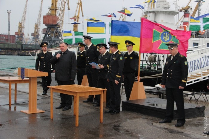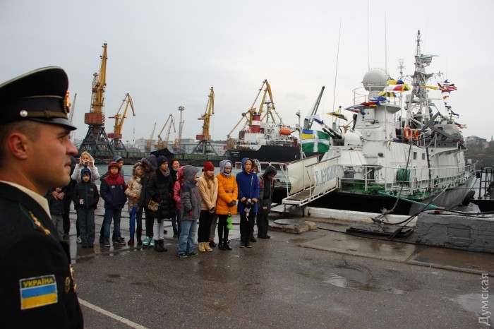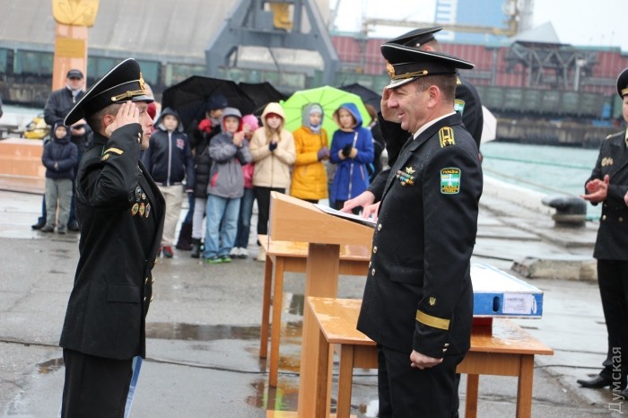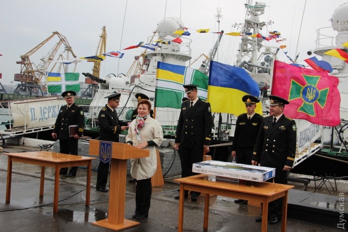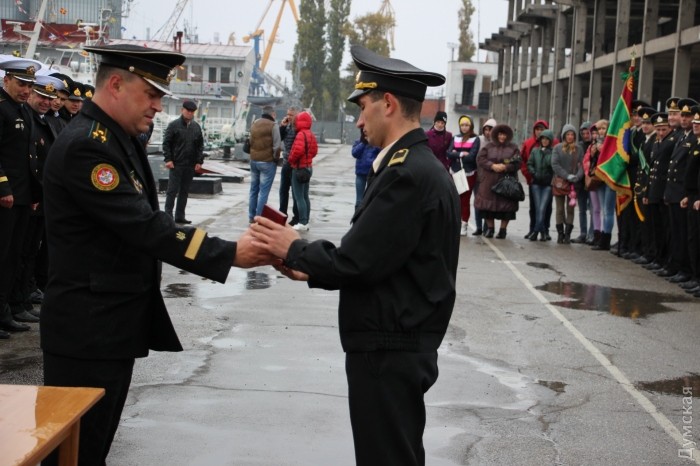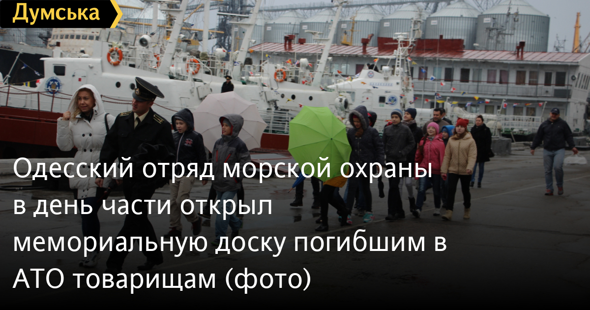Сегодня же временно установленный стенд памяти погибших в АТО заменили на стационарную мраморную доску памяти. К ней пограничники и приглашенные на праздник школьники подшефных школ, ученики морского лицея, волонтеры и шефы, которые опекают подразделения Одесского отряда морской охраны, ветераны отряда и члены семей военнослужащих части возложили цветы.