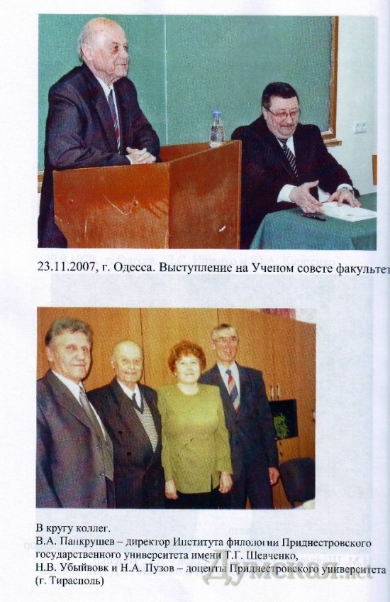 Научные труды Д.С. Ищенко известны не только в Украине, но и в ближнем и дальнем зарубежье: в России, Беларуси, Молдове, Приднестровье, Болгарии, Польше, Канаде. Дмитрий Семенович принимал участие в IX Международном съезде славистов в Киеве (1989 г.), в IV Международном конгрессе украинистов в Одессе (1999 г.), во многих международных Кирилло-Мефодиевских конференциях, в представительных международных симпозиумах «Русистика и современность» и других. В течение 17 лет, с 1993-го по 2010 год, Дмитрий Семенович заведовал кафедрой русского языка ОНУ им. И. И. Мечникова, тринадцать лет был членом ученого совета университета, 30 лет членом специализированного совета филологического факультета по защите кандидатских диссертаций. С 1975 г. Д. С. Ищенко — член Российского Палестинского общества РАН. Под научным руководством Дмитрия Семеновича защитили кандидатские диссертации 12 аспирантов. Ученики Ищенко преподают русский язык и его историю, ведут большую научную работу во многих вузах Украины и за рубежом (в Молдове, Приднестровье, России, Польше, Канаде, Бельгии, США). Кроме того, Дмитрий Семенович много внимания уделял своему внуку Александру, развивая его математические способности. В 2011 и 2012 годах его внук, ныне студент 6-го курса ИМЭМ ОНУ имени И. И. Мечникова Александр Тытченко, занял второе почетное место и получил серебряную медаль на Международной математической олимпиаде в Болгарии. Недавно – в ноябре прошлого года — Дмитрий Семенович Ищенко отметил свой 80-летний юбилей. СМЕРТЬ РОСІЙСЬКИМ ОКУПАНТАМ! Помітили помилку? Виділяйте слова з помилкою та натискайте control-enter |