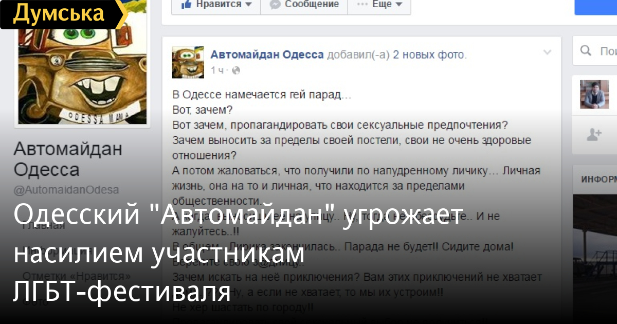Одесский «Автомайдан» пригрозил насилием участникам одесского квир-фестиваля «ОдессаПрайд-2016», если они выйдут на улицы города.