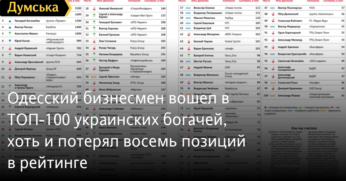 Борис Музалев в прошлом году владел состоянием в 85 миллионов долларов США, а в этом уже 72 миллиона и в прошлом году он занимал 67 место. «Финансовые показатели «Таврии В» за второй квартал 2017 года неутешительные: чистая прибыль предприятия сократилась более чем в 2 раза по сравнению с аналогичными показателями 2016 года — до 17,5 млн грн, а чистый доход уменьшился на 15,5%, до 651,8 млн грн», — отмечает издание. В то же время второй одесский бизнесмен — Леонид Климов, который занимал 71 позицию в рейтинге, в нынешний ТОП-100 уже не попал. Лидерами рейтинга, как и в прошлом году, являются Ринат Ахметов (1 место), Игорь Коломойский (2 место) и Геннадий Боголюбов (3 место). При этом состояние Рината Ахметова оценивается в 3,1 миллиардов долларов США, а в прошлом году — 2,2 миллиардов долларов. Игорь Коломойский в этом году «стоит» 1,6 миллиардов против 1,2 в прошлом, а Геннадий Боголюбов 1,5 против 1,2 миллиардов в прошлом году.