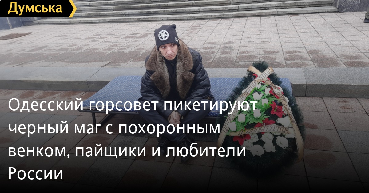 Одесский горсовет пикетируют черный маг с похоронным венком, пайщики и любители России