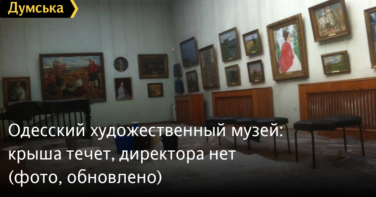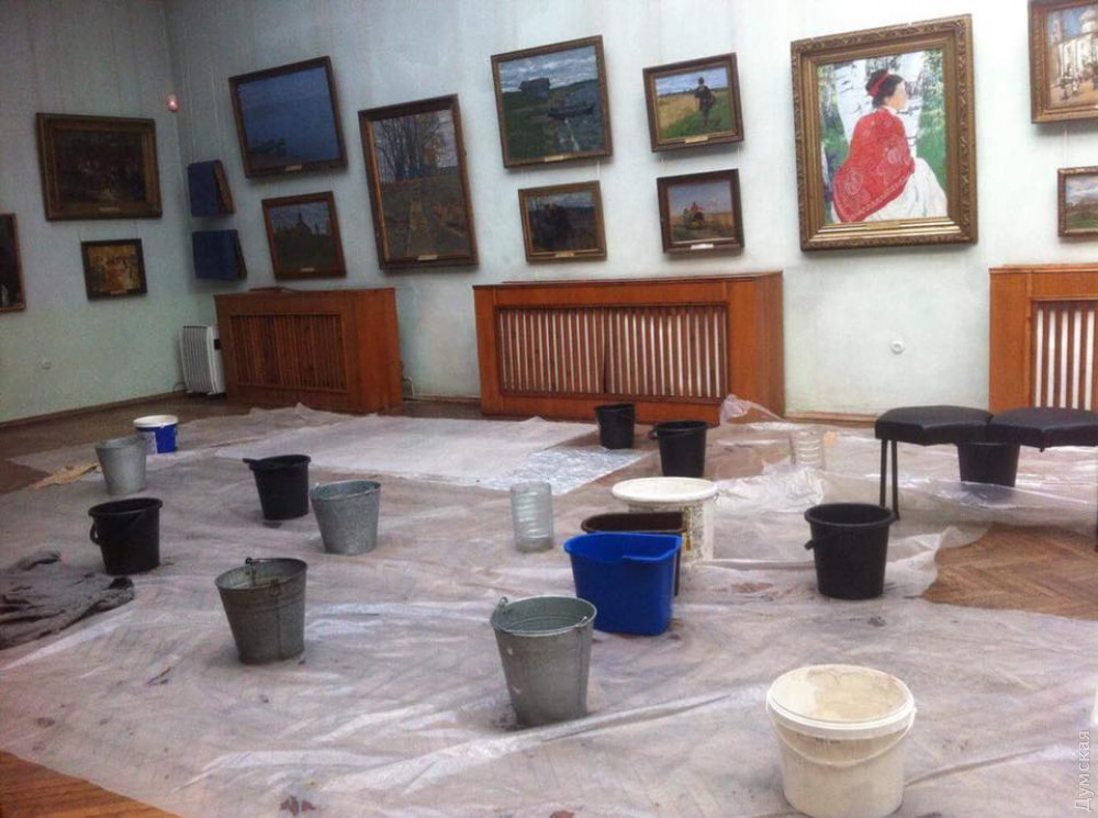 Обильный снегопад привел к тому, что протекли световые фонари над одним из залов Одесского художественного музея (официального названия у зала нет, но между собой сотрудники музея называют его «Серебряковским», так как в нем висят картины Зинаиды Серебряковой). Пришлось по накатанной схеме, как это делается уже не первый год, застелить паркетные полы полиэтиленом и собирать ведрами капель с потолков.