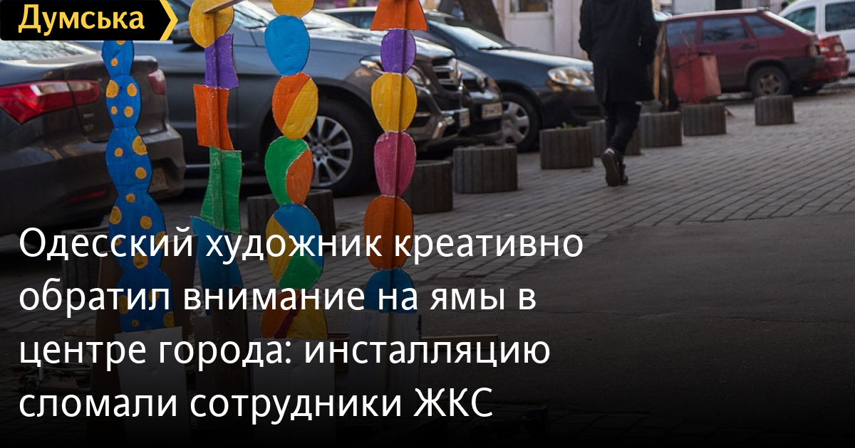 Одесский художник креативно обратил внимание на ямы в центре города: инсталляцию сломали сотрудники ЖКСИзвестный художник-акционист Кирилл Бондаренко продолжает использовать свой талант для того, чтобы поднимать важные для Одессы и одесситов вопросы. Как передает корреспондент «Думской», сегодня творец актуализировал проблему бесхозных ям, которые из-за халатности чиновников мэрии и коммунальщиков зияют, словно раны, на теле нашего города. Инсталляция получила название «Арт-яма». Кирилл украсил дыру в тротуаре на Некрасова, 6, проверяющую внимание прохожих вот уже месяц и 13 дней. «Этой идеей я продолжаю свой проект маршрутизации одесских арт-ям, — поделился с нами художник. — Этим летом яма на Ольгиевской ярко отметила четыре месяца своего существования. Там победил рассудок — яму закопали и заложили плиткой. Яме на Некрасова чуть больше месяца. Я думаю, у нее все впереди». По словам Кирилла Бондаренко, это не самая старая яма в центре города. Настоящий долгожитель вот уже два года расположен на Гоголя, возле школы. «Это очень серьезный травматизм. Ломаются ноги, руки, может ребенок упасть или животное, — говорит мастер. — Много бесхозных ям в центре. На Екатерининской площади две ямы, еще одна, очень опасная, между Дерибасовской и Греческой. А за то, что вне туристического пятачка, я вообще молчу, там все плохо». Кирилл не скрывает, что пытался не только сделать социальное заявление, но и обратить внимание горожан на проблемы современного искусства. «Арт-яма» на Некрасова отдалено напоминала абстрактную скульптуру заслуженного художника Украины Сергея Савченко, которую за деньги городского бюджета установили в парке Шевченко. «Любого вида малые архитектурные формы должны устанавливаться только после открытого конкурса и обсуждения с общественностью. В парке этого сделано не было, и результат соответствующий», — уверен Бондаренко. К сожалению, предмет остросоциального искусства просуществовал недолго — его снесли представители местного ЖКСа. Яма при этом продолжает создавать неудобства горожанам.