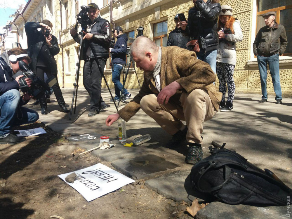 Перформанс-флешмоб в защиту старинных лавовых плит из Италии, которыми окружены клумбы на Софиевской улице Одессы, провел сегодня художник Кирилл Бондаренко.