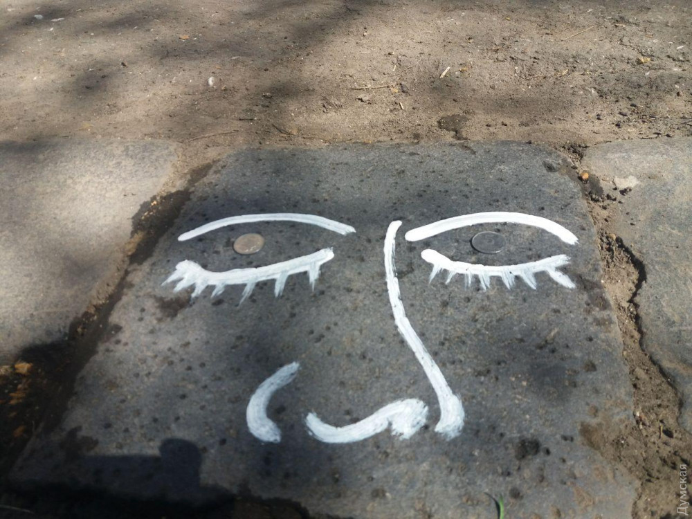 Бондаренко нарисовал на одной плите человеческое лицо и положил на глаза монеты.