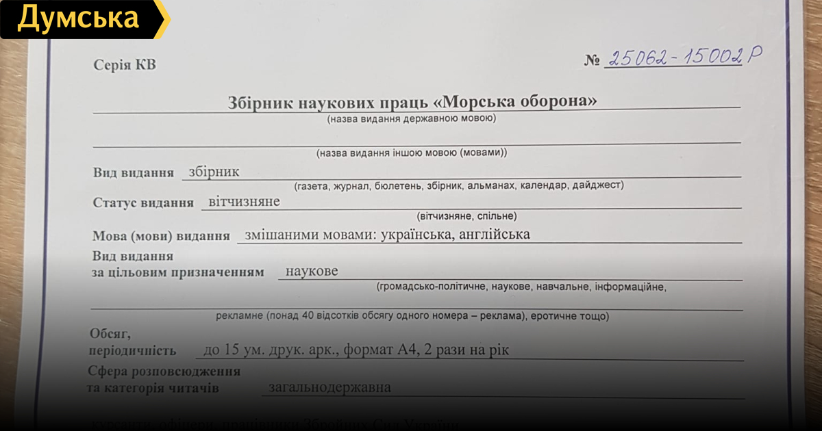 Одесский институт ВМС основал первое в Украине научное издание, посвященное военно-морской проблематикеИнститут военно-морских сил национального университета «Одесская морская академия» зарегистрировал собственное научное периодическое издание. Об этом сообщил руководитель вуза капитан первого ранга Максим Кириакиди. По его словам, журнал получил название «Морская оборона» и стал первым специализированным научным военно-морским изданием в Украине. Сейчас формируется редакционная коллегия журнала. В институте надеются, что она будет международной. СМЕРТЬ РОСІЙСЬКИМ ОКУПАНТАМ! Помітили помилку? Виділяйте слова з помилкою та натискайте control-enter Новини по цій темі: 13 лютого 2025: Одеські виші скорочують і об`єднують: Юракадемію повернули до складу університету Мечникова - хто наступний? 13 січня 2025: Реформа: в Одесі об`єднують два морські університети, а інститут ВМС стане самостійною академією 10 січня 2025: В Одеську область прилетіли птахи в мазуті: чи дійдуть нафтопродукти від затонулих російських танкерів до нашого узбережжя? 27 листопада 2024: Одеські вчені перевірили на побочку відомі ліки від ковіду, Еболи та гепатиту С: спойлер - є проблеми |