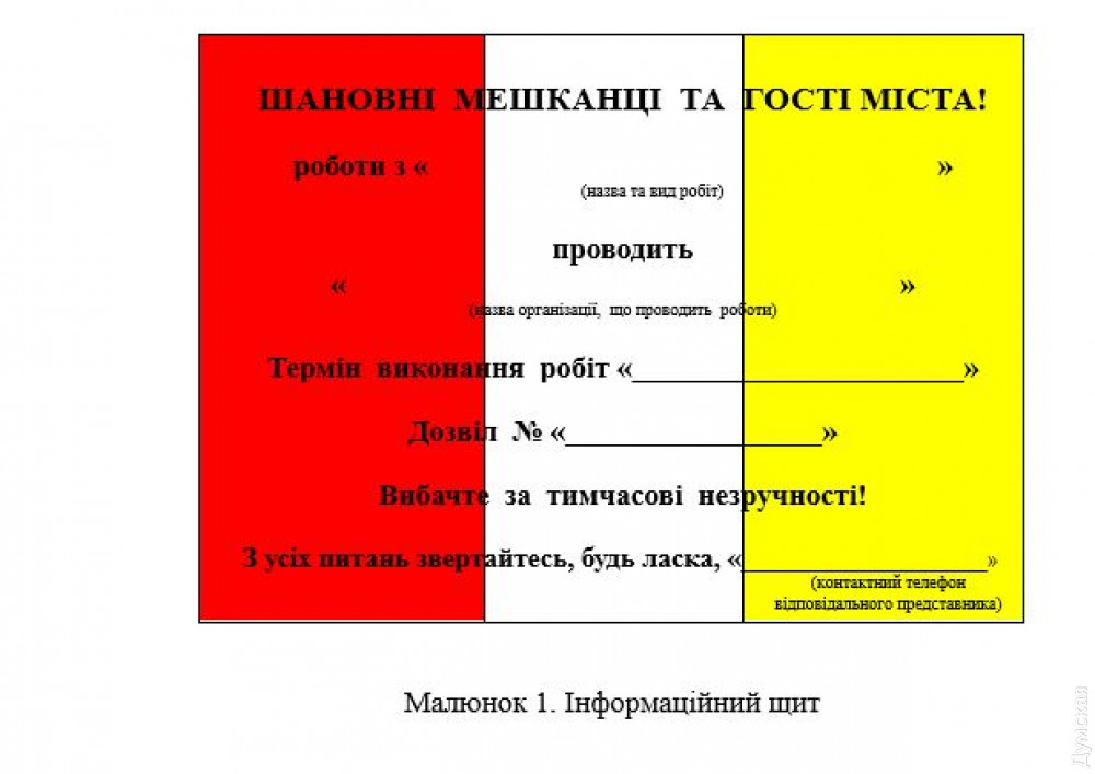 Также планируется стандартизация информационных щитов, которые устанавливаются у места проведения коммунальных работ. Щиты будут выполнены в цветах флага Одессы, высотой в 0,6 и шириной в 0,4 метра. На них необходимо написать, какие работы проводятся, какая организация ими занимается, сроки выполнения, номер полученного разрешения и контактный телефон для справок.