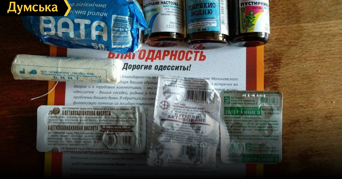 Одесский нардеп раздает избирателям пустырник и активированный уголь (фотофакт)Не гречкой единой. Нардеп Геннадий Чекита в преддверии внеочередных парламентских выборов раздает пенсионерам своего округа набор медикаментов. В него входят по одной конвалюте активированного угля, ацетилсалициловой кислоты и «цитрамона», флаконы с настойками пустырника и валерианы, перекись водорода, бинт и вата. Вместе с «аптечкой» избирателям вручают письмо Геннадия Чекиты с его подписью. СМЕРТЬ РОСІЙСЬКИМ ОКУПАНТАМ! Помітили помилку? Виділяйте слова з помилкою та натискайте control-enter