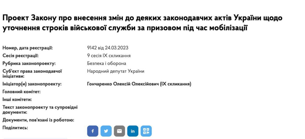 Він подав у Раду відповідний законопроєкт №9142 — про внесення змін до Закону України «Про військовий обов'язок і військову службу».