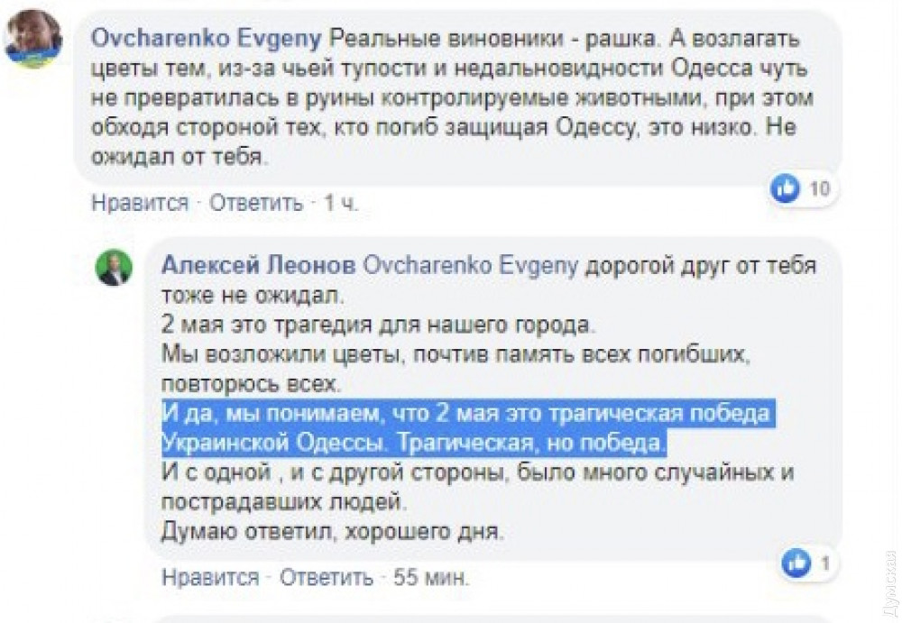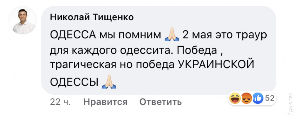 «2 мая это трагедия для нашего города. Мы возложили цветы, почтив память всех погибших, повторюсь всех. И да, мы понимаем, что 2 мая это трагическая победа Украинской Одессы. Трагическая, но победа. И с одной, и с другой стороны, было много случайных и пострадавших людей», — написал нардеп (орфография и пунктуация сохранена, — Ред).