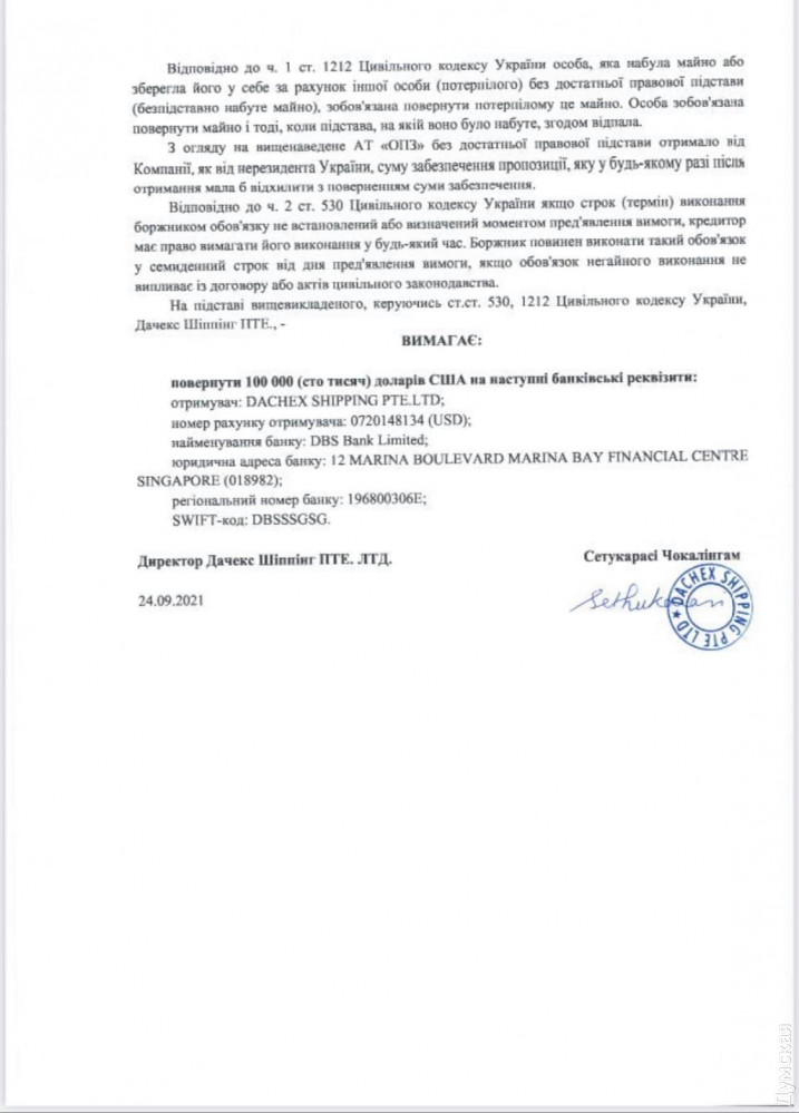 Сингапурская компания Dachex Shipping Pte. Ltd., победившая в июле на конкурсе по выбору поставщика давальческого сырья для Одесского припортового завода, отказалась подписать договор с предприятием.