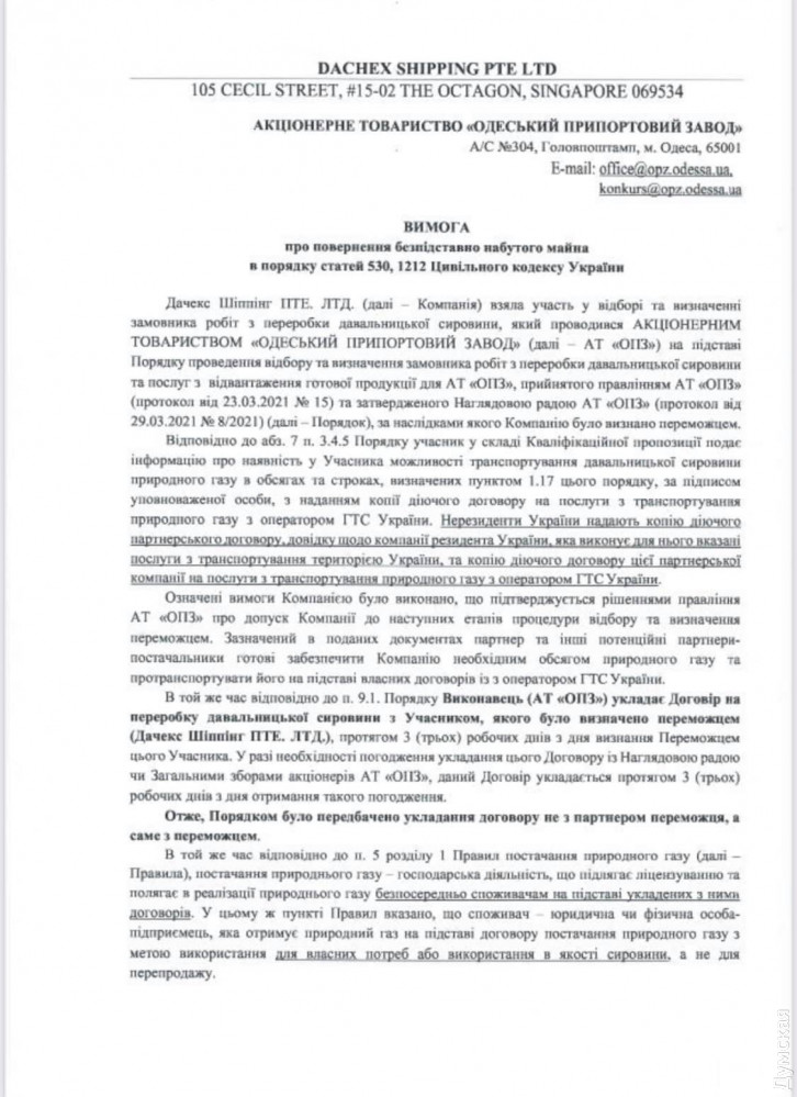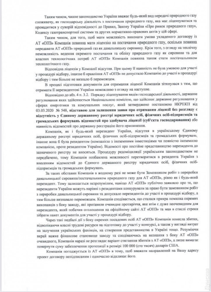 «Поэтому остается непонятным, зачем АО ОПЗ публично заявляло о том, что нерезиденты Украины могут наравне с резидентами конкурировать за право быть заказчиком работ по переработке давальческого сырья, допускало нерезидентов к участию в процедуре отбора и тем более определило победителем. Компания надеется, что была допущена досадная ошибка отдельных исполнителей со стороны завода, которые упустили очевидное противоречие, которое, однако, является весьма неочевидным для нерезидента, который увидел объявление на официальном сайте ОПЗ и должен был в сжатые сроки собрать пакет документов для участия в процедуре отбора», – заявили в Dachex.