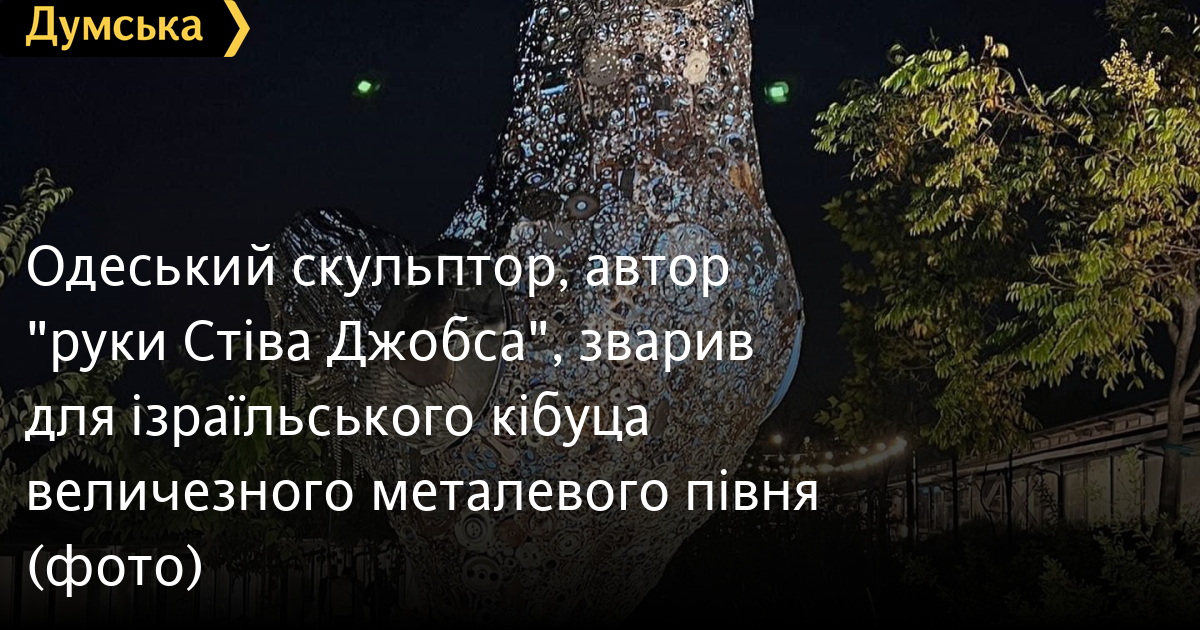 Одеський скульптор, автор «руки Стіва Джобса», зварив для ізраїльського кібуца величезного металевого півняВідомий одеський скульптор, який спеціалізується на роботі з металом, автор пам'ятника «Спасибі, Стів» на Новосільського Кирило Максименко продовжує творити попри війну. Новий твір одесита — чотириметровий півень, зварений із металевих запчастин, встановлений у кібуці Кфар-Еціон в Ізраїлі. Як розповів «Думській» Кирило Максименко, арт-об'єкт прикрашає територію коворкінгу, на який перетворили птахофабрику, що закрилася. Зазначимо, що це не перший анімалістичний персонаж від Кирила Максименка. Раніше для кіпрської автомобільної компанії одесит створив двотонного бика, а в Одесі перетворив на краба старенький «Фіат». Помітили помилку? Виділяйте слова з помилкою та натискайте control-enter |