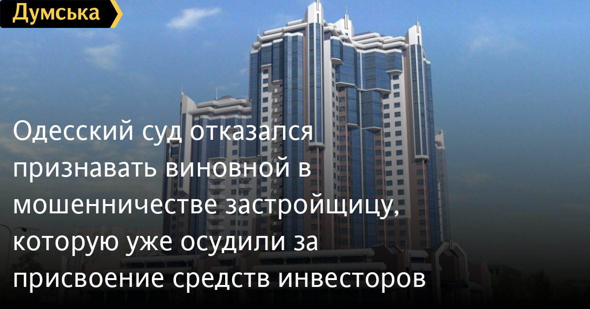 Одесский суд отказался признавать виновной в мошенничестве застройщицу, которую уже осудили за присвоение средств инвесторовМалиновский районный суд Одессы оправдал по делу о мошенничестве главу компаний «Златоград» и МЧП «Рассвет» Ларису Лебедеву, которую ранее осудили за завладение средствами инвесторов строительства. Как передает корреспондент «Думской», такой приговор коллегия под председательством судьи Дмитрия Передерко вынесла 15 марта. Служители Фемиды констатировали, что противоправное деяние, в котором обвинялась Лебедева, имело место, однако она уже понесла за него ответственность в рамках другого уголовного производства, открытого по части 5 ст. 191 УК Украины: Суворовский районный суд Одессы приговорил женщину к 10 годам лишения свободы с конфискацией имущества. Этот приговор вступил в силу. Напомним, в 2004-2009 годах возглавляемые Ларисой Лебедевой фирмы привлекли по инвестиционным договорам около 15 миллионов долларов. Еще 30 млн долларов она взяла в кредит у банков. На эти средства застройщица обещала возвести ряд объектов, в том числе 27-этажный монолитно-каркасный жилой комплекс «Золотое руно» на Люстдорфской дороге. Запланированные дома остались в проекте, деньги людям и финансовым учреждениям Лебедева так и не вернула. СМЕРТЬ РОССИЙСКИМ ОККУПАНТАМ! Заметили ошибку? Выделяйте слова с ошибкой и нажимайте control-enter |