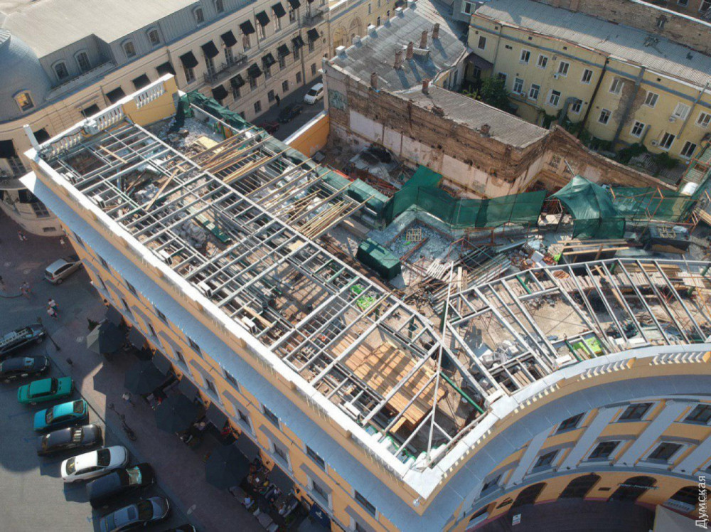«В 2017 году на фасаде проводились реставрационные работы. В этом году наша задача — сделать кровлю и внутренний фасад. Для этого необходимо сделать полноценный выход на крышу здания. Изначально он осуществлялся через маленькое отверстие 50 на 50 см. Сейчас мы делаем полноценный технический выход для дальнейшего обслуживания крыши. То, что вы видите на фото, это не надстройка, это что-то вроде ограждающего парапета. За ним и будет технический выход», — говорила тогда «Думской» представитель группы «Инкор».