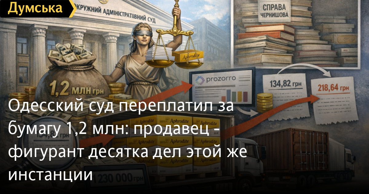 Одесский суд переплатил за бумагу 1,2 млн: продавец — фигурант десятка дел этой же инстанцииОдесский окружной административный суд переплатил более 1,2 млн гривен при покупке бумаги, причем компании, директор компании-поставщика проходит по нескольким делам, которые слушает эта инстанция. Посчитать на сколько завышена стоимость помогли договоры ООО «Вилайн груп» по другим тендерам, размещенные в «Прозорро». Мы проанализировали только два последних года — 2024-й и 2025-й, хотя сотрудничают они намного дольше. В декабре 2025-го суд покупает у «Вилайн груп» канцтоваров на 2,6 млн грн. Самая внушительная строка этого договора — 13,2 тысячи пачек бумаги общей стоимостью 2,1 млн грн. Цена одной пачки — 182,58 грн. Бумага на простая, а золотая Aphrodite, в розницу мы такую не нашли. Оптом тоже. Позвонили в несколько компаний, торгующих канцелярией — нет такой бумаги в наличии. Редкость, проще говоря. Мы проанализировали тьму договоров этого ООО, и такая бумага встречается во многих. Но каждому контрагенту «Вилайн груп» назначает свою цену. Это логично, частная компания хочет заработать как много больше. Но все эти контракты — в открытом доступе. Не изучить их перед тем, как составлять собственное тендерное предложение — как минимум странно, как максимум — попахивает коррупцией. На Рождество, 25 декабря, точно такую же бумагу (плотность: 80 г/м2; белизна СІЕ: 169%; толщина: 110 мкм; непрозрачность: 94%; класс А) приобретает Одесский научно-иссдледовательский экспертно-криминалистический центр МВД Украины. Причем покупает партию в 20 раз меньше — 788 пачек намного дешевле — за 134,82 грн. Немногим ранее Госаудитслужба купила ту же бумагу за 146,34 грн. Итого, переплата составила 630 тысяч гривен. Необычно и другое, в условиях контракта четко оговорено — весь товар, то есть 13 200 тысяч пачек бумаги должны быть отгружены до 31 декабря. Речь о примерно 41 кубометре или 33 тоннах. Для понимания масштаба: это около полутора стандартных 20-футовых контейнеров (по объёму загрузки). В декабре 2024 окружной админсуд снова покупает канцтовары на 2,3 млн грн. Из них 2,1 млн на бумагу. В этот раз 9,8 тыс. пачек Paperline за 218,64. Победила опять «Вилайн груп». А вот Винницкое высшее профессиональное училище департамента полиции охраны купило же товар у того же продавца (причем партия намного меньше, всего 50 пачек) по 156,9 грн. Это даеи нам еще 605 тыс. грн переплаты. По данным платформы YouControl, компания выиграла тендеров на 661,2 млн грн, чуть больше 40% торгов, в которых принимала участие (почти 6 тыс.). Причем если в 2017-м речь шла об 15,6 млн, к 2025-му выросла до 126,8 млн. За два неполных месяца 2026-го — 14,6 млн. ООО «Вилайн груп» зарегистрировано в Одессе и работает с 2012-го. Директор, сооснователь и бенефициар — Александр Чернышов. Второй учредитель (в равных долях) и бенефициар — Игорь Видов. Интересный факт, через Одесский окружной админсуд прошло минимум восемь дел, в которых стороной выступает сама компания и Чернышов как ее представитель. Еще по несколько дел в Приморском райсуде, а также в апелляции и кассации. Чаще всего речь о признании или непризнании налоговых накладных или изменений в них, разного рода нарушения финансовой и налоговой отчетности. СМЕРТЬ РОССИЙСКИМ ОККУПАНТАМ! Заметили ошибку? Выделяйте слова с ошибкой и нажимайте control-enter |