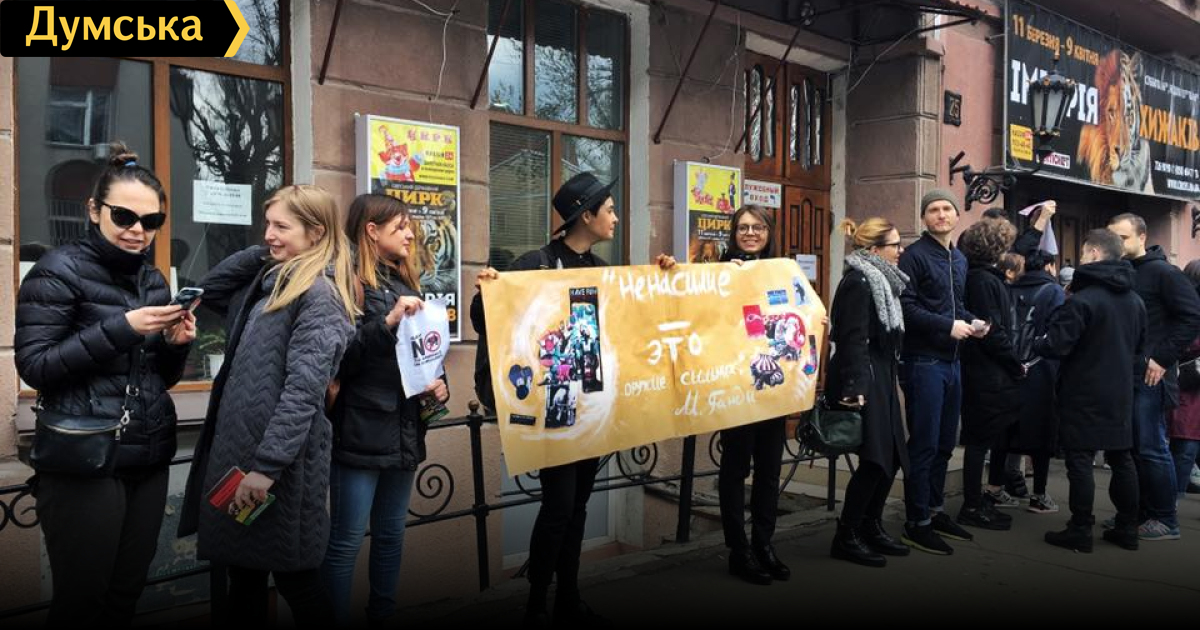 В воскресенье, 9 апреля, возле здания Одесского цирка прошла акция протеста против использования животных в представлениях.