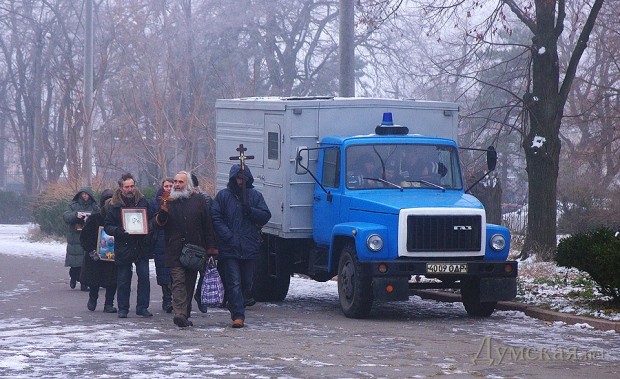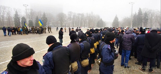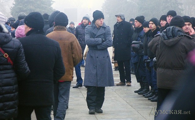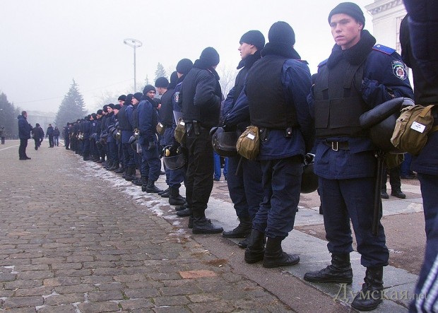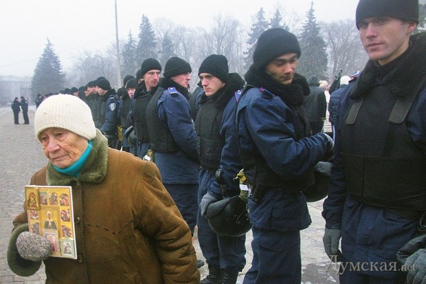 Милиция, выступавшая в данном случае вполне согласно своему предназначению, выставила кордон между сторонами, тем самым не дав активистам перейти от слов к делу.