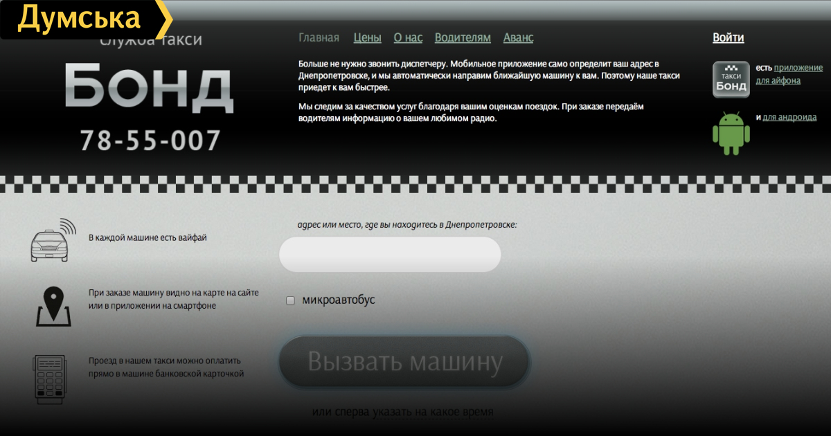 Днепропетровский сайт службы — taxibond.dp.ua, одесский — bond.od.ua.